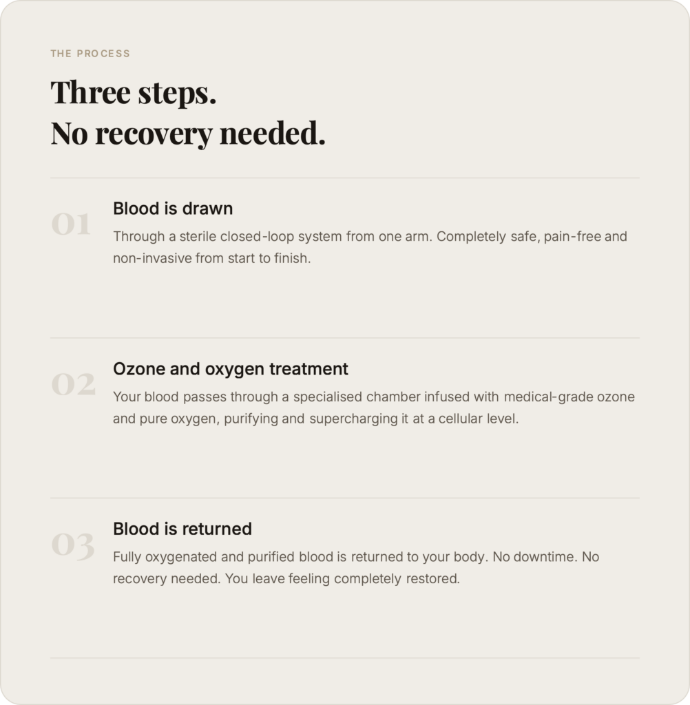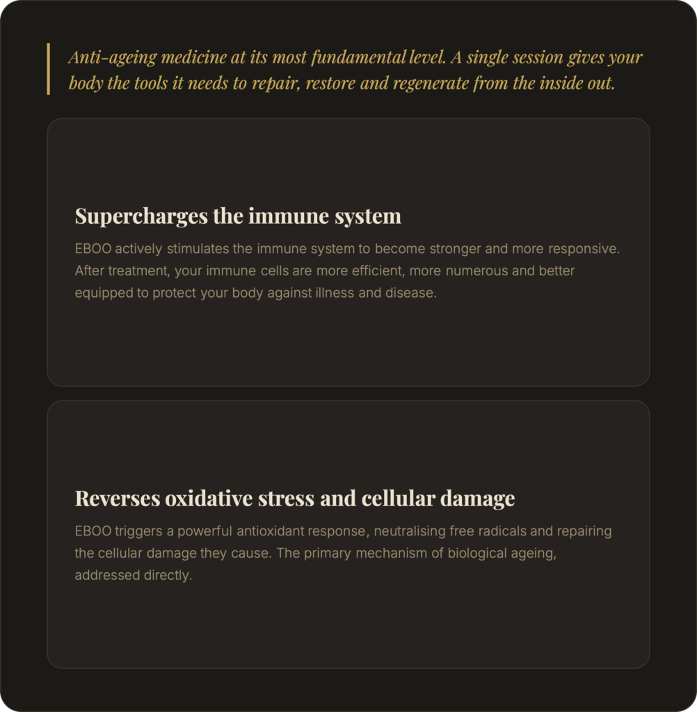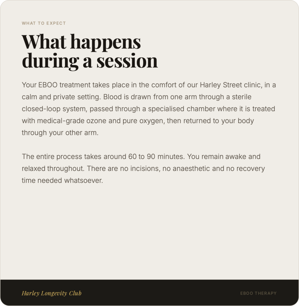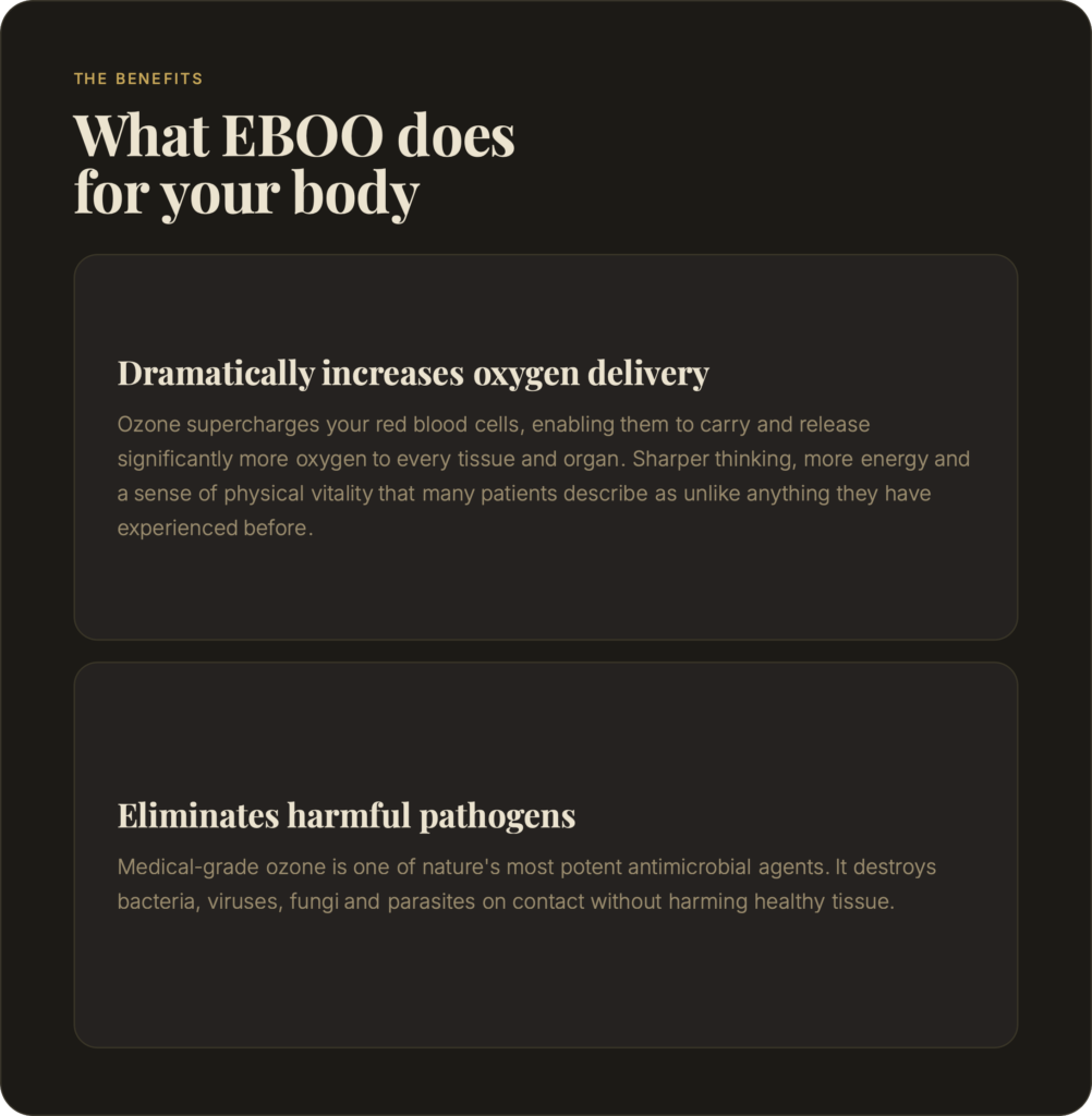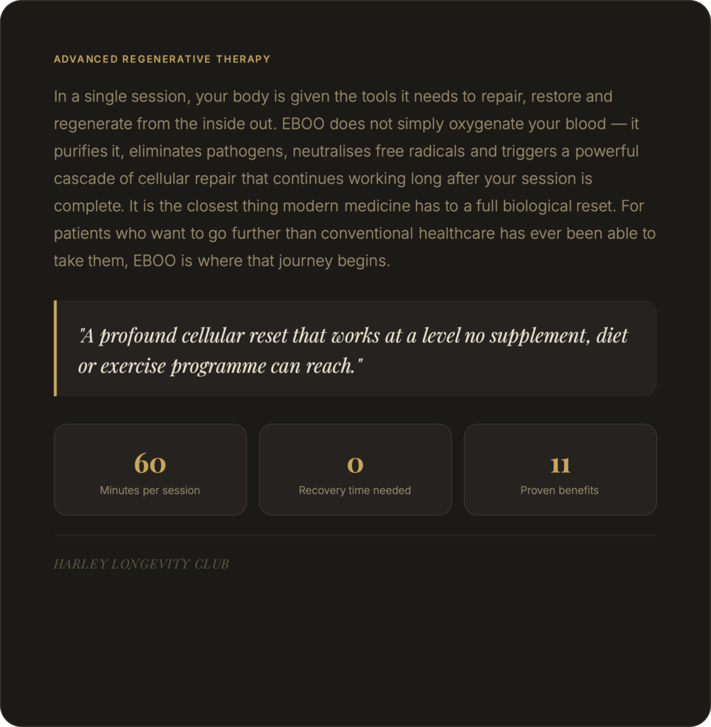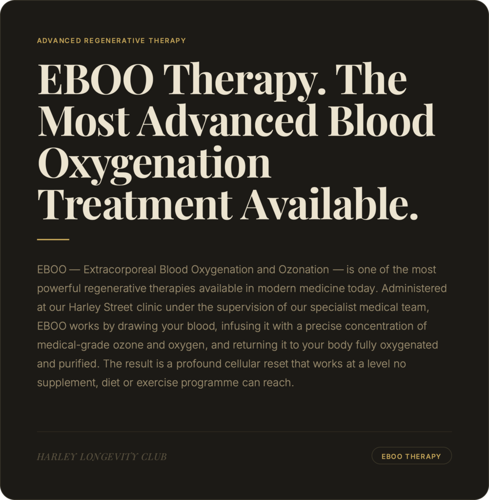 EBOO — Extracorporeal Blood Oxygenation and Ozonation — is one of the most powerful regenerative therapies available in modern medicine today. Administered exclusively at our Harley Street clinic under the supervision of our specialist medical team