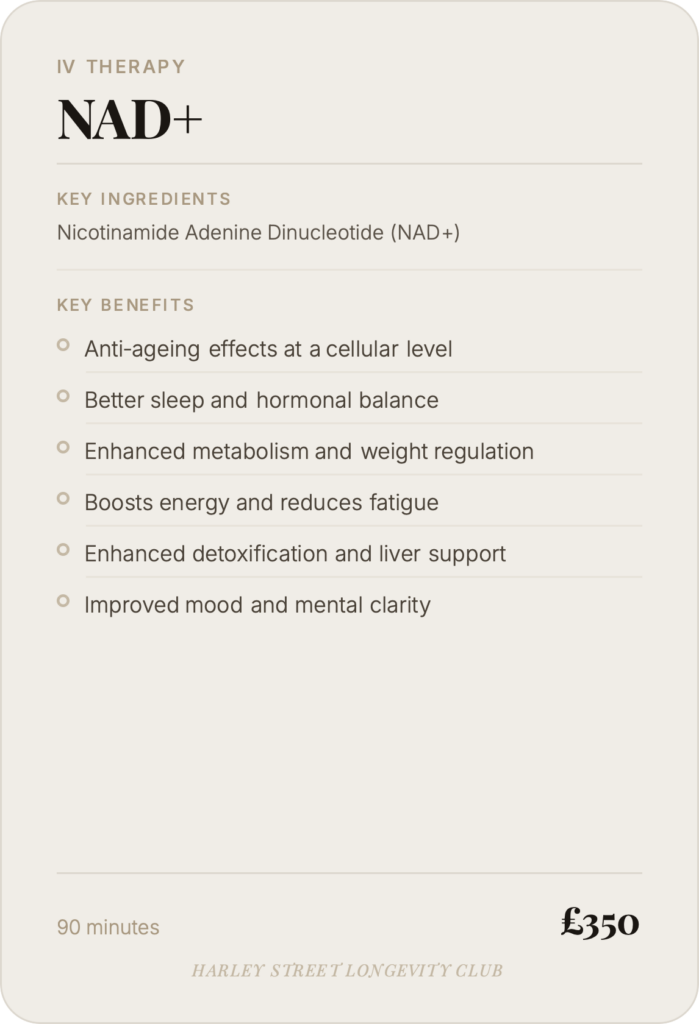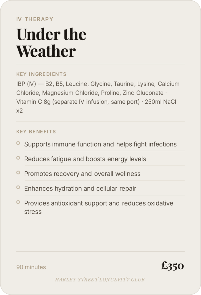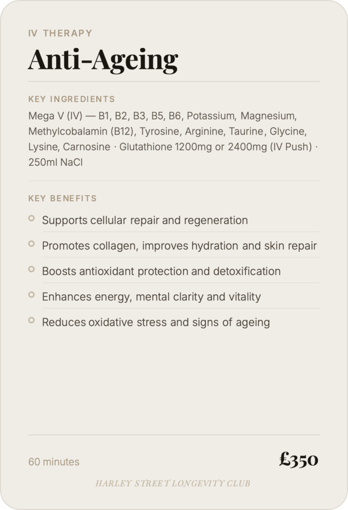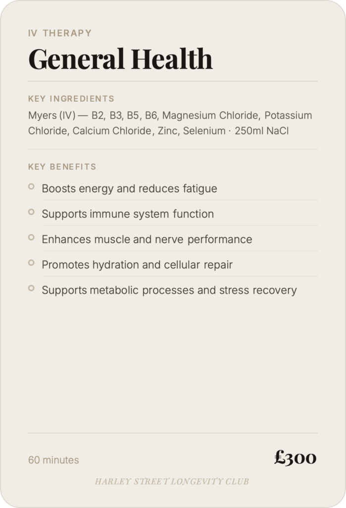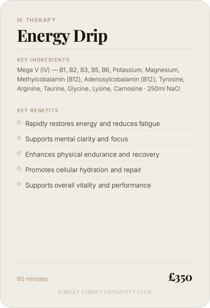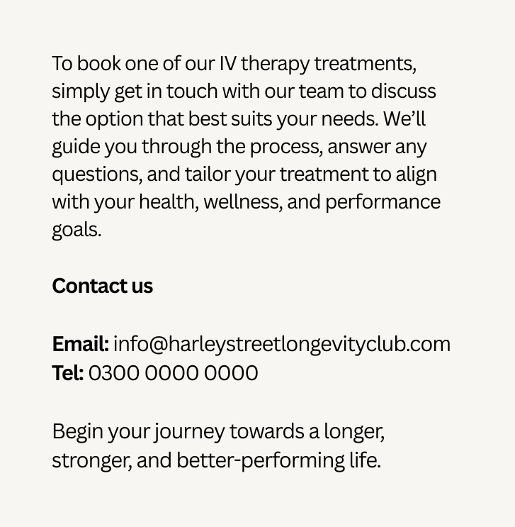 At Harley Longevity Club, we offer a full range of IV therapies designed to optimise your health, energy, and longevity. From NAD+ and anti-aging drips to high-dose Vitamin B12 and hydration treatments, each infusion is tailored to support cellular repair, boost energy, enhance cognitive function, strengthen immunity, and slow the effects of ageing, helping you feel revitalised from the inside out.