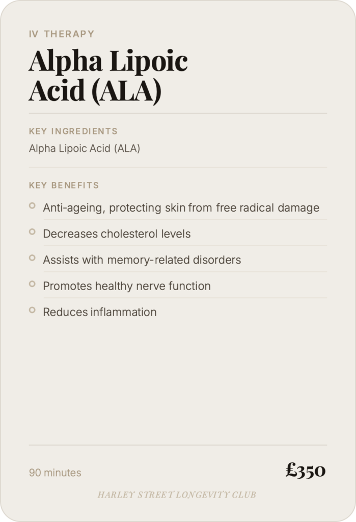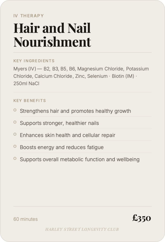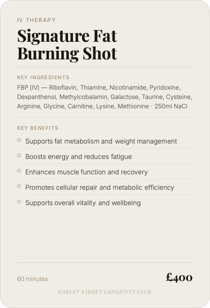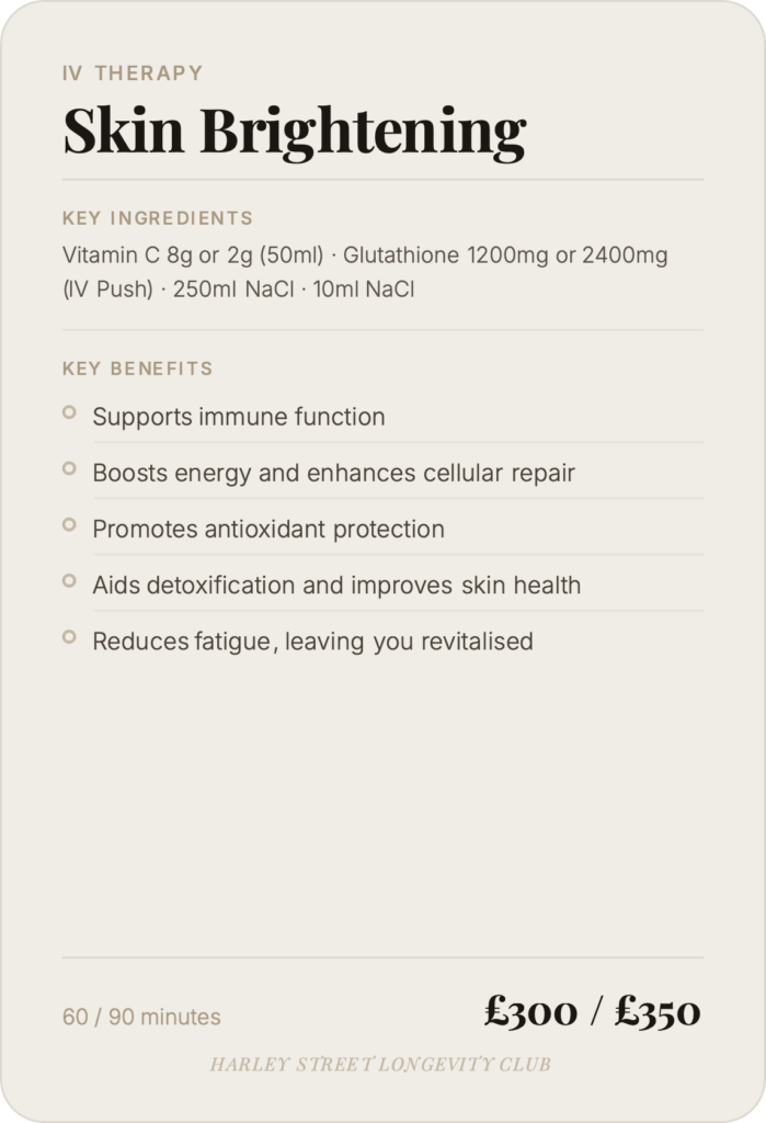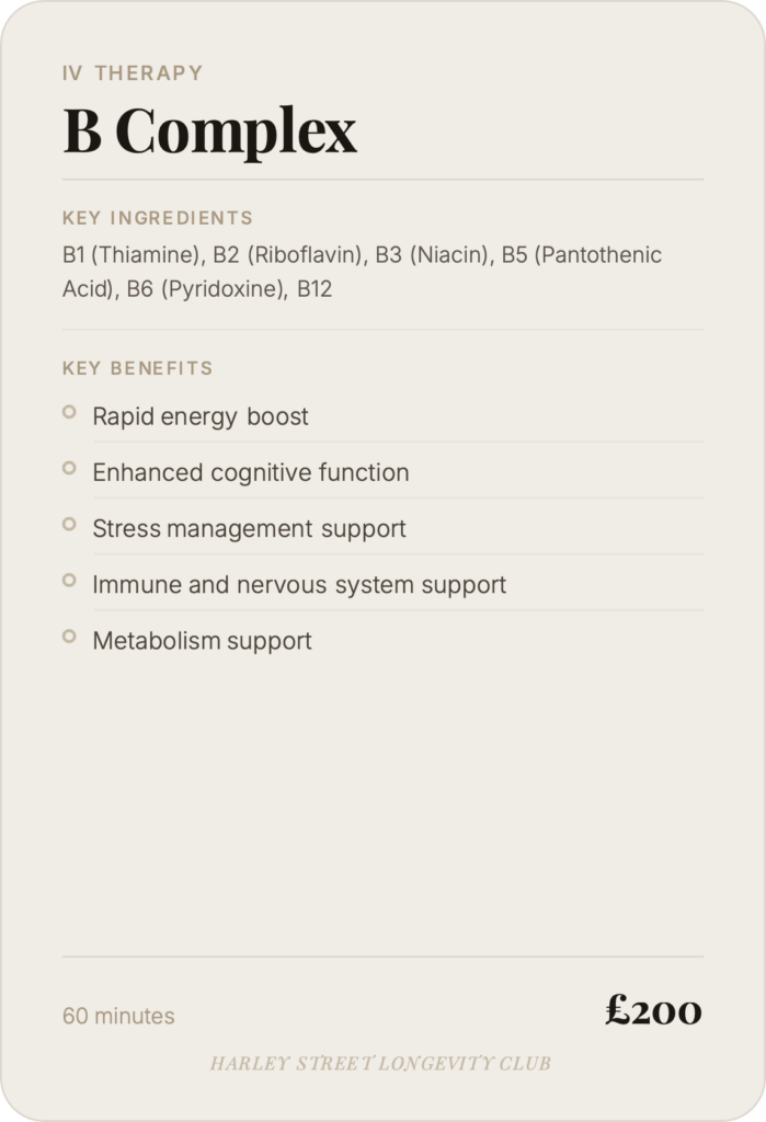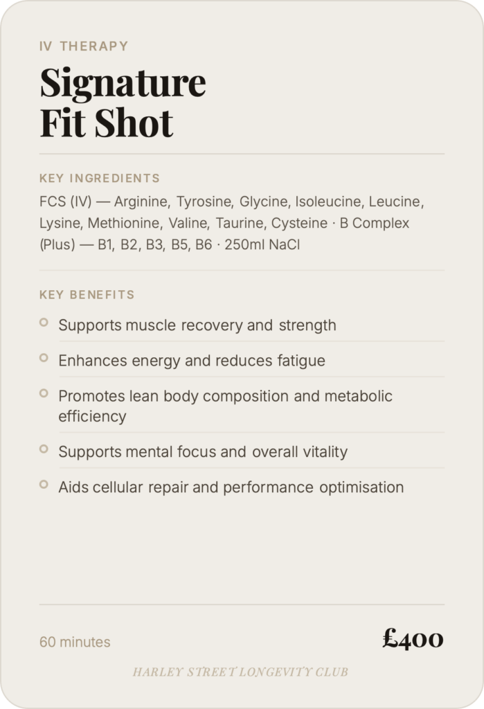 At Harley Longevity Club, we offer a full range of IV therapies designed to optimise your health, energy, and longevity. From NAD+ and anti-aging drips to high-dose Vitamin B12 and hydration treatments, each infusion is tailored to support cellular repair, boost energy, enhance cognitive function, strengthen immunity, and slow the effects of ageing, helping you feel revitalised from the inside out.