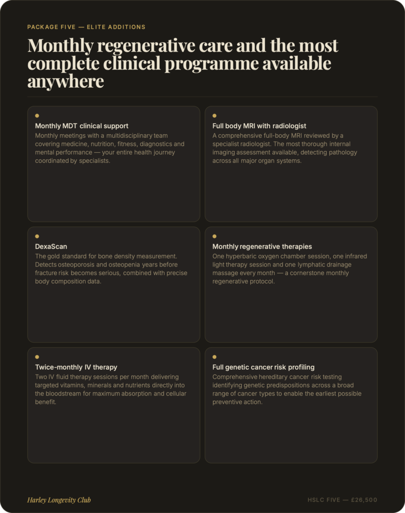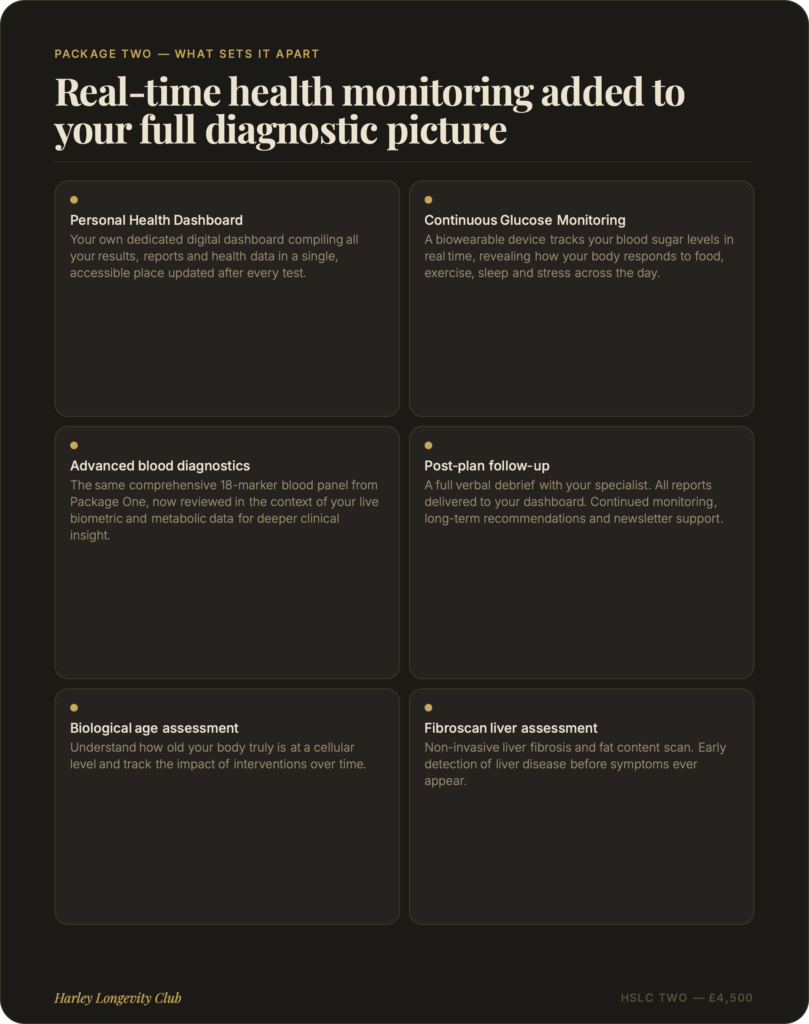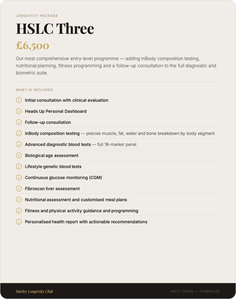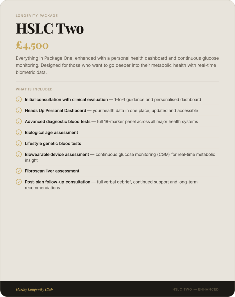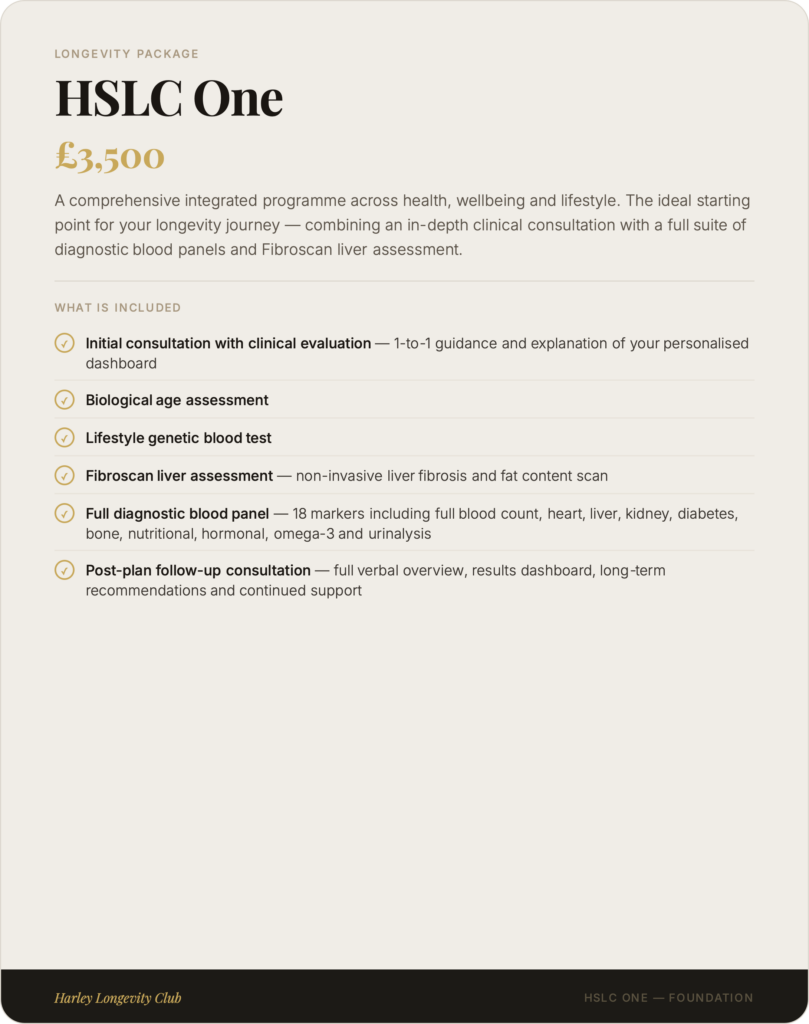 At Harley Longevity Club, our longevity packages are designed to go far beyond a standard health check. Each programme combines advanced diagnostic testing, clinical consultation and personalised health planning into a single, seamless experience — giving you and your clinical team the most complete picture of your health available anywhere in London. From our foundation package to our elite all-inclusive programme, every tier is built around one principle: understanding your biology in full, so we can help you take meaningful control of it.