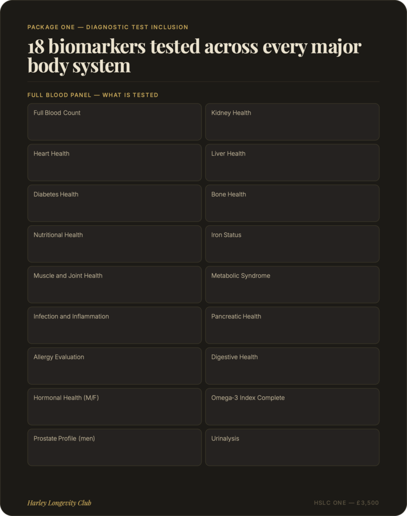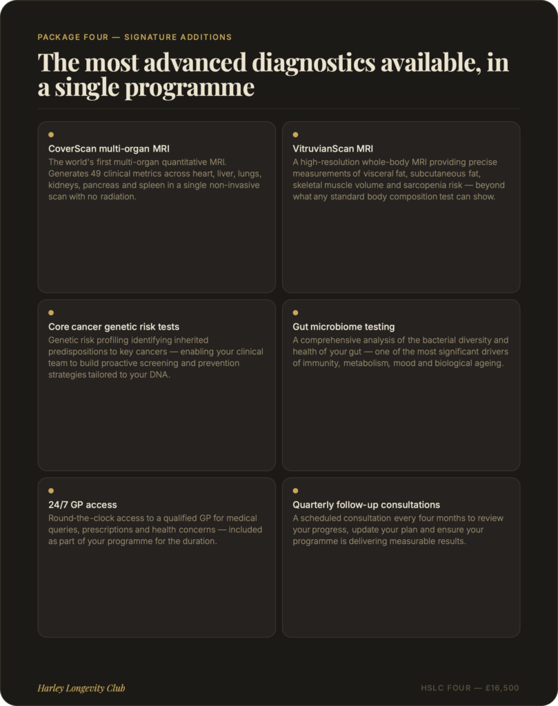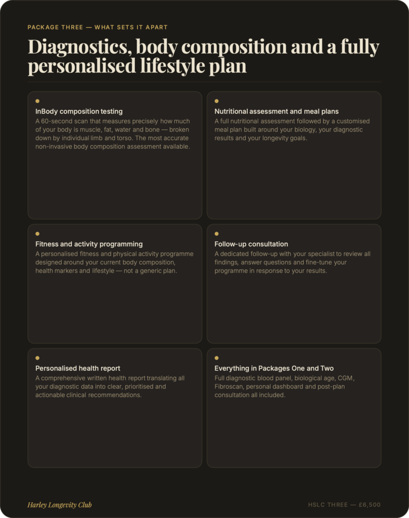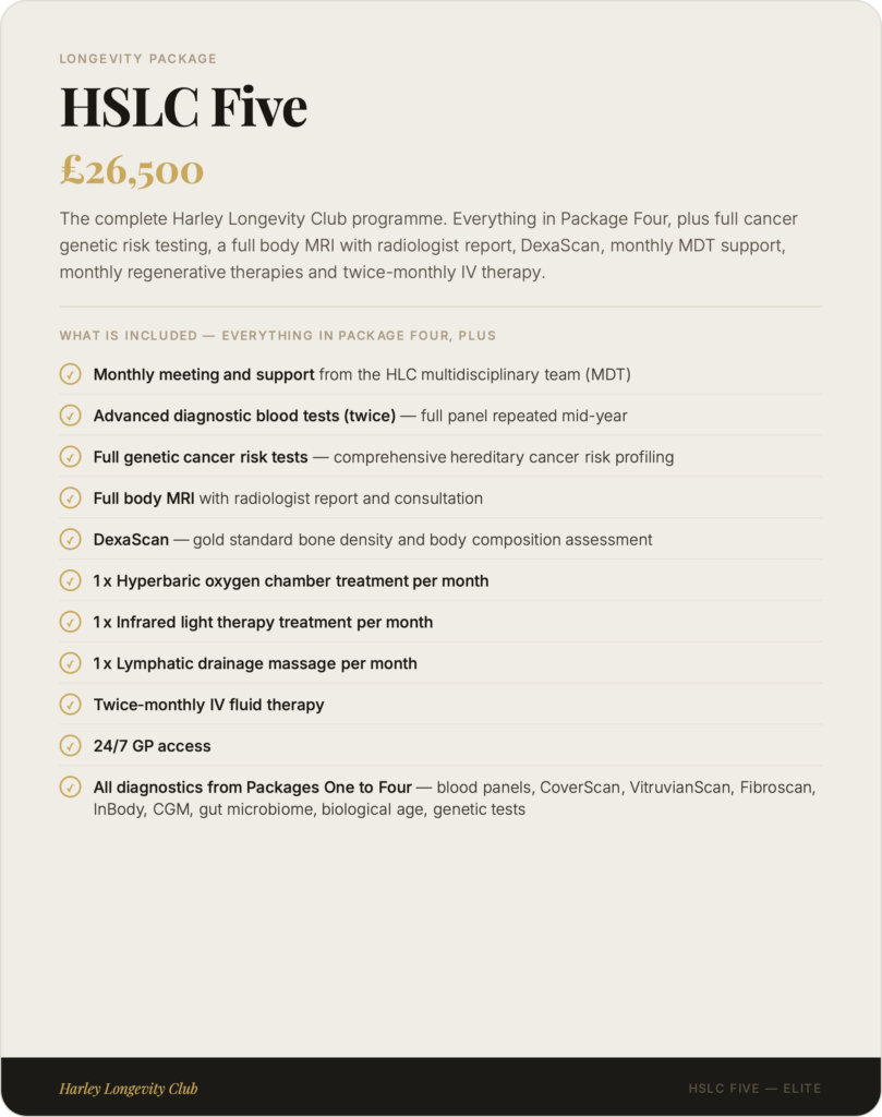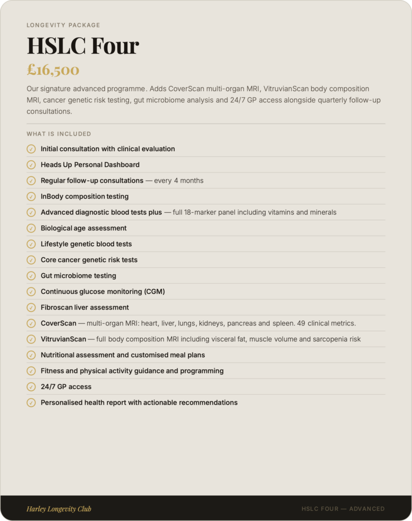 At Harley Longevity Club, our longevity packages are designed to go far beyond a standard health check. Each programme combines advanced diagnostic testing, clinical consultation and personalised health planning into a single, seamless experience — giving you and your clinical team the most complete picture of your health available anywhere in London. From our foundation package to our elite all-inclusive programme, every tier is built around one principle: understanding your biology in full, so we can help you take meaningful control of it.