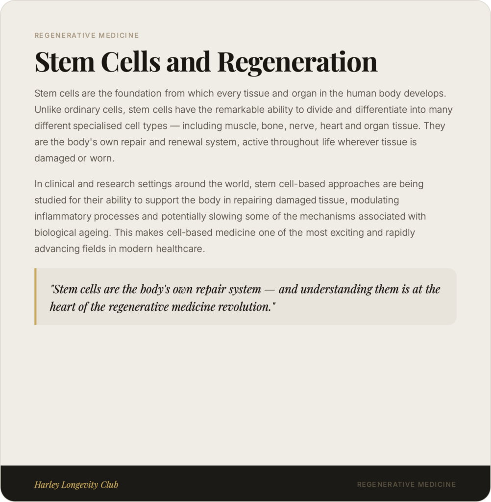 Regenerative medicine is an emerging field of science that explores the body's own capacity to repair, restore and renew itself at a cellular level — moving beyond the treatment of symptoms to address the underlying biological processes that drive disease, decline and ageing.